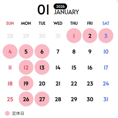 4/1 (月曜) 定休日 4/8 (月曜) ~9 (火曜) 連休 4/15 (月曜) 定休日 4/22 (月曜) 定休日 4/29 (月曜) 定休日